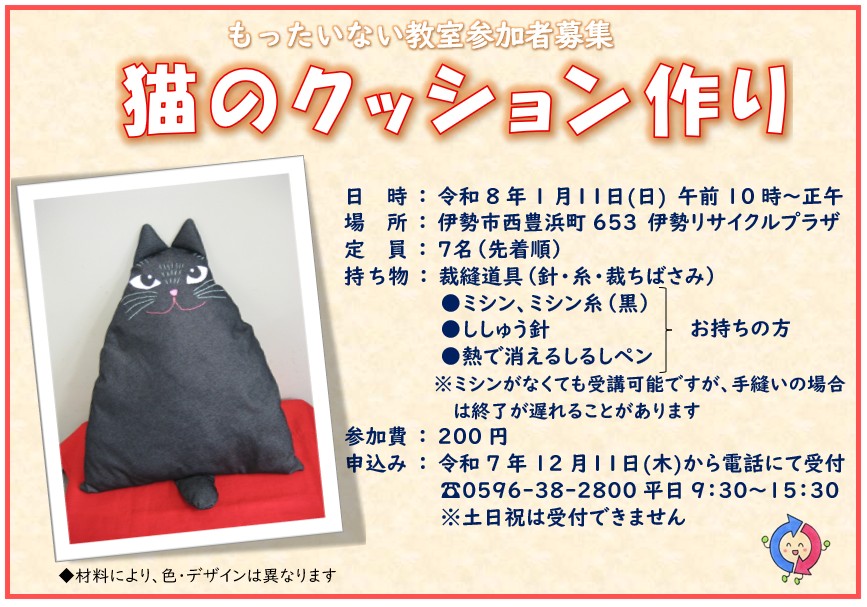 猫のクッション作り参加者募集◆キャンセル待ちのみ募集◆